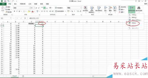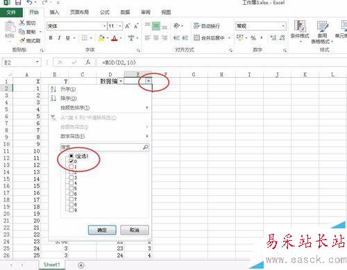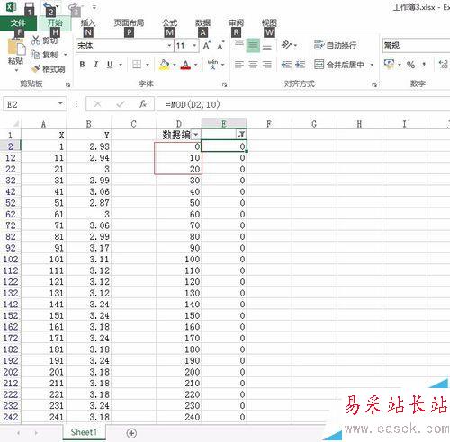 4、利用篩選工具實現每10個數據點選取1個數據點:選中整列(0~9循環列),點擊篩選,在篩選條件里勾選0,即可獲得每10個數據點取一個的數據。