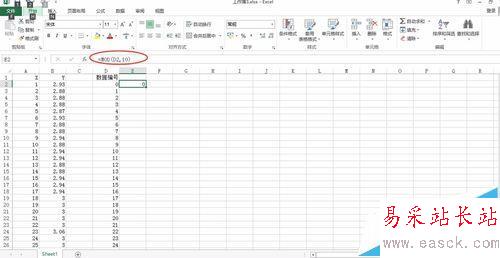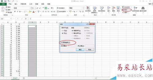 2、給數據點進行編號:先手動輸入起始值0,然后選中需要填充的單元格,再點擊填充-序列-列-等差系列-預測趨勢-確定,即可完成編號。