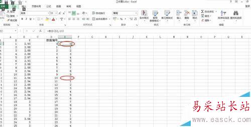 3、利用求余公式MOD(被除數,除數),得到0,1,...,9循環數列:輸入=mod(D2,10)回車,得到第一個余數0;選中需要填充的單元格,按Ctrl+D實現整列單元格的公式填充,獲得余數為0,1,.... ,9的循環數列。