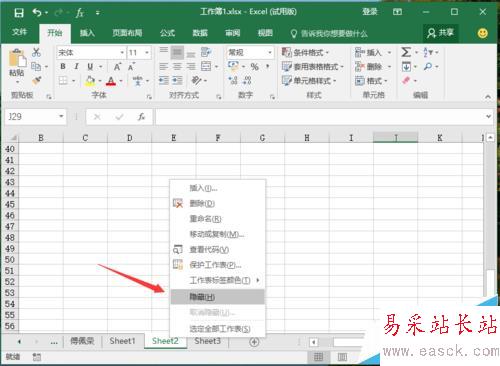 3、點擊“隱藏”選項后,我們選中的工作表就會被隱藏起來了。如圖所示;
