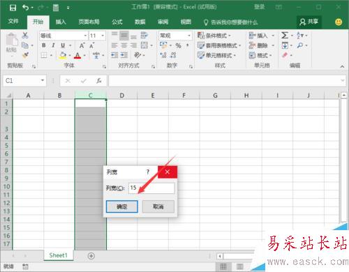 8、在打開的“列寬”對話框中,輸入我們需要設置的列寬,如“15”,然后再點擊“確定”按鈕。如圖所示;