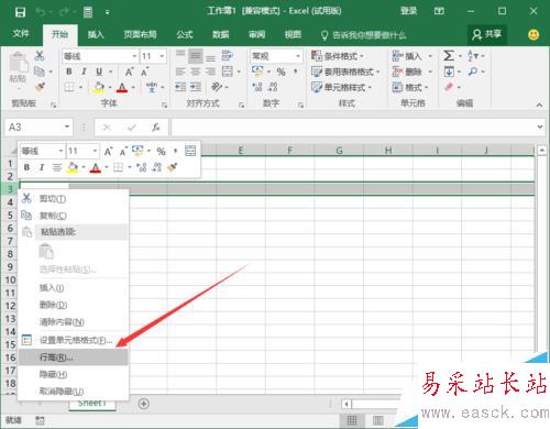 2、在新建的工作簿編輯區域,選中需要改變行高的行,接著點擊鼠標右鍵,在彈出的菜單選項中,點擊“行高”選項。如圖所示;