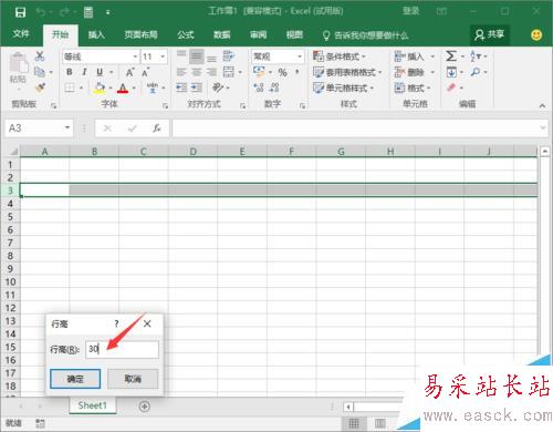 4、在打開的“行高”對話窗口中,輸入我們需要設置的行高,如“30”,然后再點擊“確定”按鈕。如圖所示;