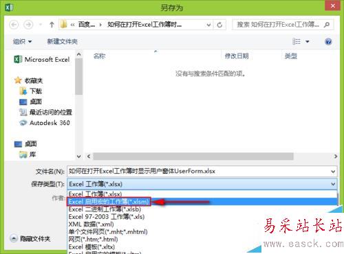 6、另存為能保存VBA宏的文件。為了測試在打開Excel工作簿時立即顯示用戶窗體,需要將.xlsx文件另存為一種能保存VBA宏的文件格式,這里選擇.xlsm文件格式。