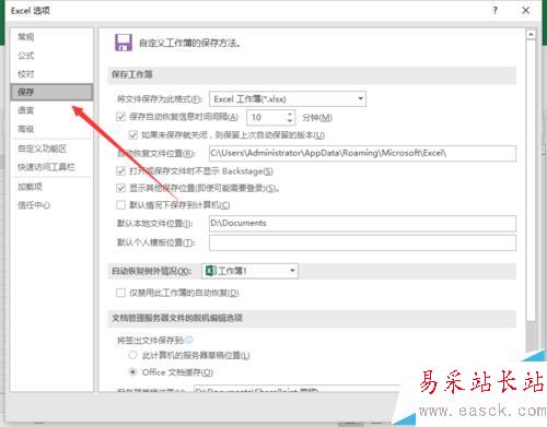 5、在“Excel選項”對話窗口中,選擇左側的“保存”選項卡欄。如圖所示;