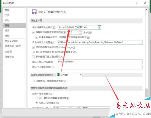 6、在“保存”選項右側窗格中,找到“保存演示文稿”區域下的“將文件保存為此格式”并在其中選擇為【Excel97-2003工作簿】,然后再點擊“確定”按鈕即可。如圖所示;