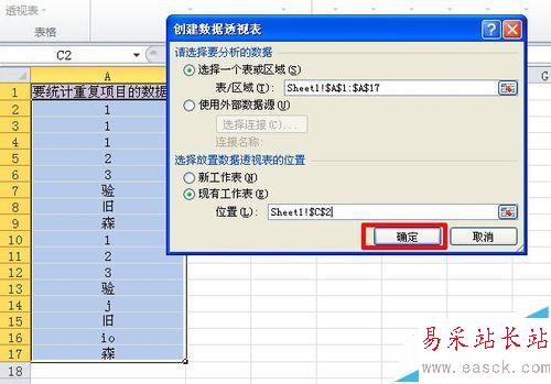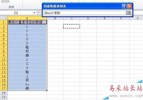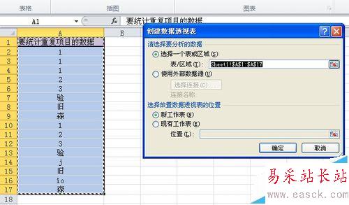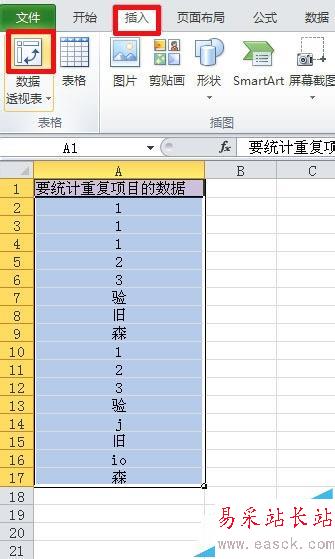注意:單元格A1為這一列數據的列名,用數據透視表來統計項目的重復次數,列名是必不可少的。沒有列名的,請在這一列數據前添加一個列名,列名具體叫什么并不重要。