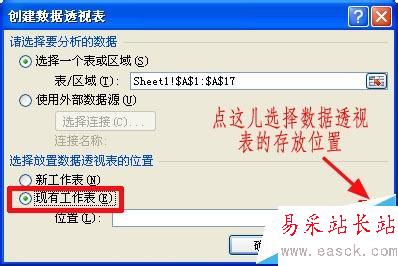 4、先在“創建數據透視表”的對話框中點擊“現有工作表”。再點擊“位置”右邊的選擇按鈕,見下圖。來選擇數據透視表的存放位置。