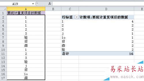 10、這時你再回過頭來看表格區域,數據透視表已經將單元格區域A2:A17中所有項目的重復次數列出來了。其中C列為項目列表,D列為項目的重復次數,見下圖。