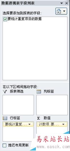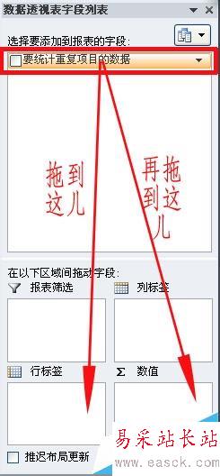 9、點擊“要統計重復項目的數據”,然后往“行標簽”里拖,再往“數值”里拖。見下圖。