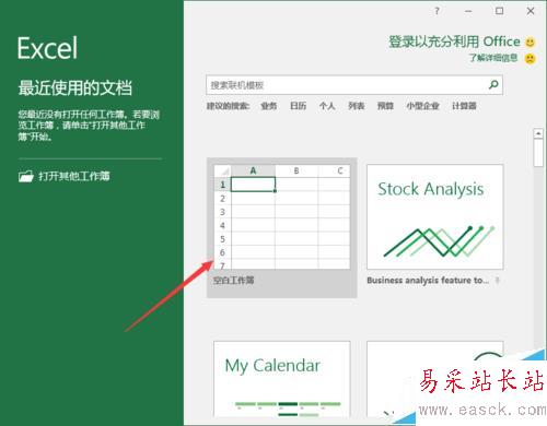 1、鼠標左鍵雙擊計算機桌面Excel2016程序圖標,將其打開運行。在打開的Excel2016程序窗口,點擊“空白工作簿”選項,新建一個空白的工作簿。如圖所示;