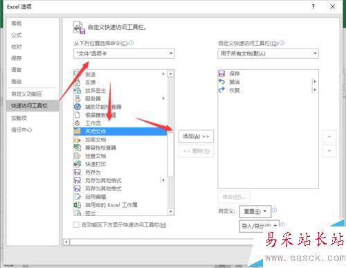 6、在”快速訪問工具欄“選項卡欄,將“從下列位置選擇命令”選取為““文件”選項卡”,然后找到“關閉文件”工具將其選中,再點擊“添加”按鈕。如圖所示;