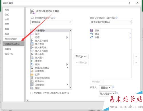 5、在Excel選項對話窗口中,將選項卡切換到“快速訪問工具欄”選項卡欄。如圖所示;