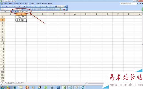 3、在編輯欄的等于號后點擊B1單元格,在鍵盤上輸入乘以*0.1,鍵盤輸入加號+,再點擊B1單元格,編輯的內容是:=B1單元格*0.1+B1單元格,意思是:B1單元格中的數字乘以0.1(0.1是10%的漲停板)再加上B1單元格中的數字