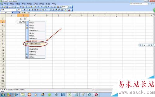 4、此時B2單元格顯示的數字為14.9050,選擇B2單元格,點擊鼠標右鍵,在彈出的對話框中選擇設置單元格格式