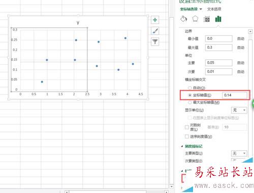 6、設置橫坐標與縱坐標交叉點坐標(我這里設置的是0.14),標簽位置選擇”底部“,如圖六