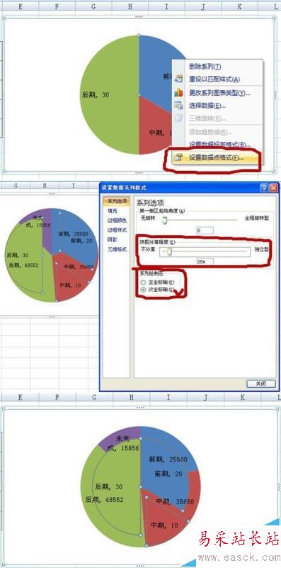 4、上述步驟完成后,選擇餅圖,點擊鼠標右鍵并在彈出菜單中選擇【設置數據點格式】,在彈出窗口中設置餅圖分離程度進度值,系列軸制在選擇【次坐標軸】,點擊【確定】。然后依次點擊餅圖中里面的不同扇形,把它們一個個拖拉到中間位置。