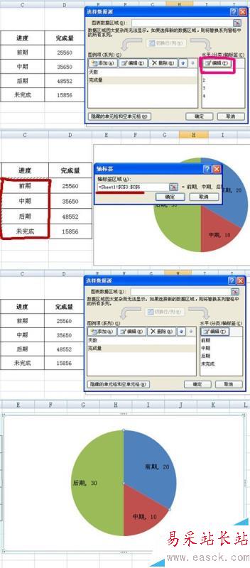 3、回到選擇數據源的窗口,水平分類軸標簽點擊【編輯】,在彈出的軸標簽中,選擇數據源中完成量對應的周期,然后點擊【確定】。