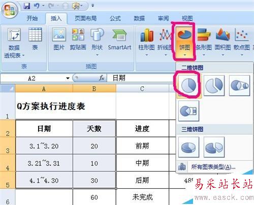 1、打開excel,建立所需數據源,選擇周期數據源,【插入】--【餅圖】--【二維餅圖】,選擇第1個餅圖,建成餅圖,顏色可自行選擇調整。