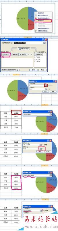 2、在餅圖上,點擊鼠標右鍵,在彈出的菜單中選擇【選擇數據】,在窗口中選擇【添加】,系列名稱選擇【完成量】,系列值選擇對應的完成量下的所有數據,然后【確定】。
