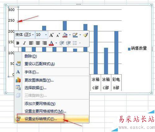 1、如圖這是一張家電行業銷售業績表。我們想把Y軸間隔修改成不是從0開始的坐標軸。因為我們可以看到銷售量最小的超過100,最大也不超過260.