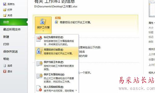 1:新建一個Excel文件,打開“文件”-“信息”-“保護工作簿”-“用密碼進行加密(E)”