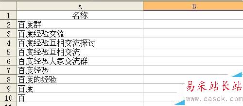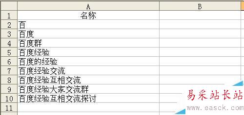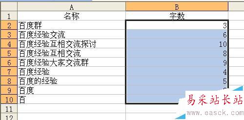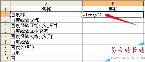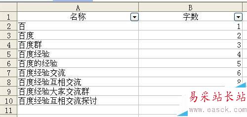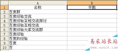 2、在這里主要以A列的數列為主,讓A列的名稱內容按照字數從少到多進行升序排列,直接在A列進行升序排列是不準確的,需要再B列中進行數字轉換,首先在B1的標題中寫上“字數”名稱。(如下圖)