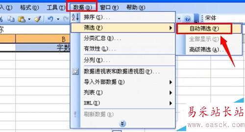 5、然后點擊菜單中的數據,在篩選功能中選擇自動篩選,(如下圖)在這里小敏用的excel是2003版的,其他版本在進行數據刷選排序時會比較快。