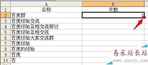 4、輸完公式之后,直接點擊enter(回車鍵),就會出現一個數字3,跟A2中的“百度群”對應,說明3代表的是3個漢字,然后把鼠標放在在B2單元框中的右下角,當出現一個“+”符號的時候,雙擊鼠標左鍵,進行數值的填充和下拉。(如下圖一、圖二)