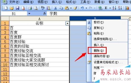 8、這時候可以全選B列,然后點擊鼠標右鍵,在彈出來的菜單中選擇刪除,(如下圖一),再取消自動篩選,就可以看到A列中的文字內容都是按照字數的多少進行排序的。(如下圖二)