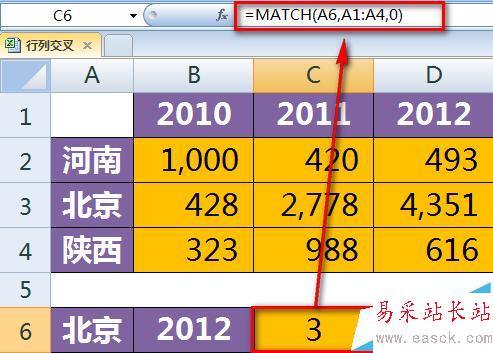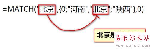 5、知識點說明:MATCH()函數返回第一參數在第二參數所在的位置。如下圖,“北京”在第二參數的數組中是第3個值,因此函數返回3。