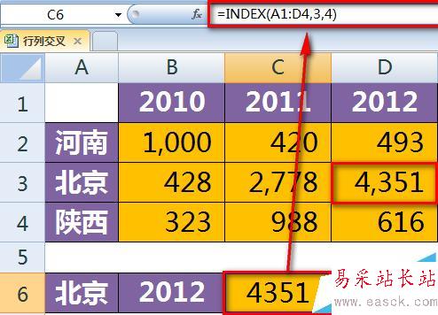 2、根據A6和B6單元格內容,我們可以看到要取的值是A1:D4中第三行第四列的內容。我們利用INDEX()函數可以提取出相應內容。雙擊C6單元格,輸入公式:=INDEX(A1:D4,3,4)