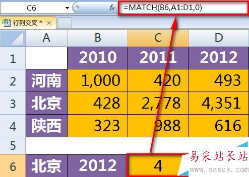 4、判斷行數和列數可以用MATCH()函數。雙擊C6單元格,輸入公式:=MATCH(A6,A1:A4,0),結果返回3,也就是A6單元格的“北京”在A1:A4中是第3個數。