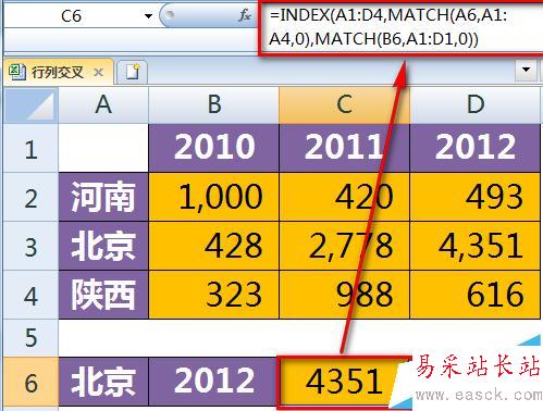 7、最后,將兩個MATCH()函數和INDEX()函數合并在一起,修改為:=INDEX(A1:D4,MATCH(A6,A1:A4,0),MATCH(B6,A1:D1,0)),回車后就可以得到行列交叉處的值了。