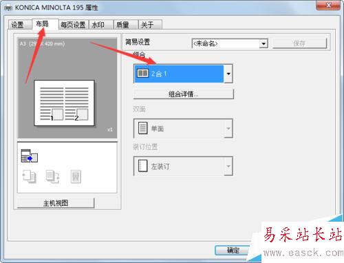 2、然后選擇打印機(jī)屬性的布局(如下圖)→組合 選擇2合一(如下圖)點(diǎn)確定