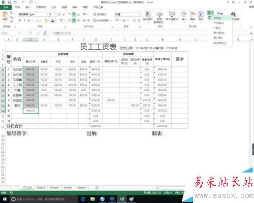 2、如圖所示,正常的操作方法是,復(fù)選需要自動(dòng)求和的范圍單元格,然后點(diǎn)擊自動(dòng)求和快捷按鈕得到結(jié)果,每列都需要手動(dòng)去操作。