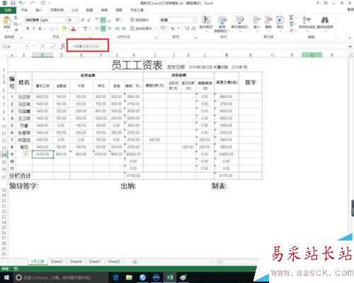 7、我們觀察下單元格內(nèi)的公式,發(fā)現(xiàn)“alt+=”快捷組合鍵填充的是求和公式,所以在切換其他自動(dòng)求值方式時(shí),我們可以使用查找替換函數(shù)的功能,來完成這一目的。