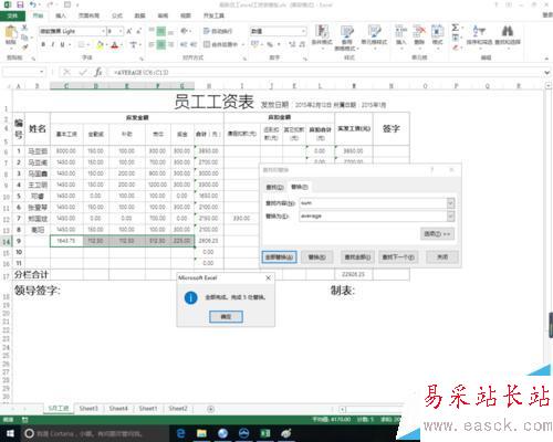 9、比如說我們需要求平均數(shù),那么直接在查找編輯欄中輸入sum,然后在替換欄中輸入average,點(diǎn)擊全部替換,即可完成自動(dòng)求值的切換。