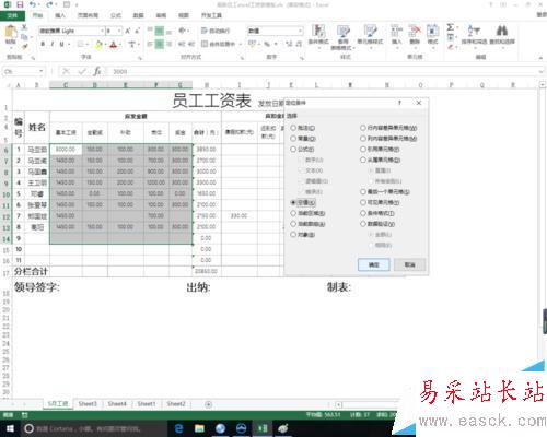 4、按下F5鍵,或者在開始標(biāo)簽面板中點(diǎn)擊查找與選擇按鈕,在下拉菜單中選取定位條件選項(xiàng)。在定位條件中選擇空值定位。點(diǎn)擊確定。