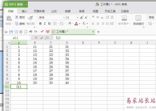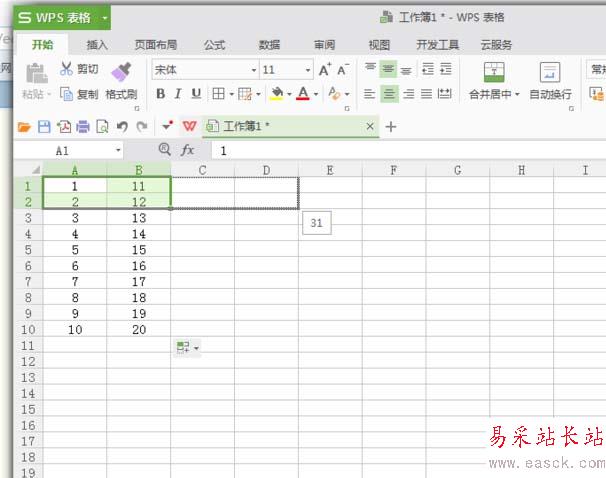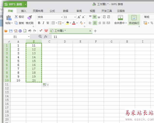 2、確定第二列(B列)數據。填充A列到10,然后以A1為起點,填充B列數據(數據為11-20)。如圖: