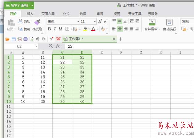 3、填充第三列和第四列(C列和D列)數據。以A、B為參考數據,縱橫填充矩陣(鼠標拖動直接填充,若不能自動變換,請按Ctrl切換填充方式)。如圖: