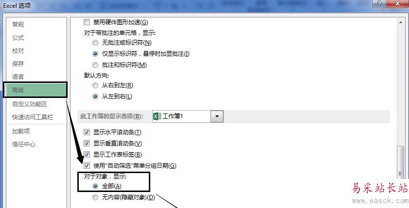 2、選擇“高級”,定位到“此工作簿的顯示選項”,找到|“對于對象,顯示:”,勾選全部