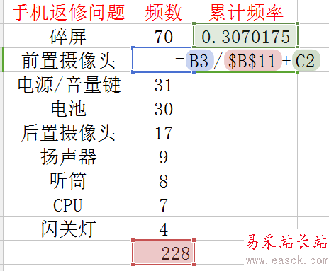 4、第二個累積頻率的計算公式”=B3/$B$11+C2“,按回車。”$“號是絕對符號,$B$11表示固定表格B11。
