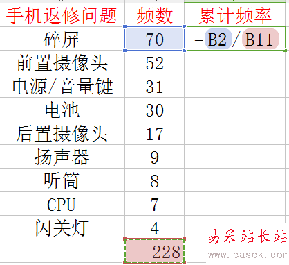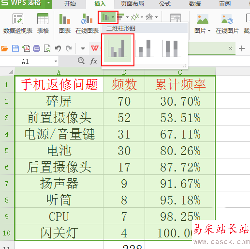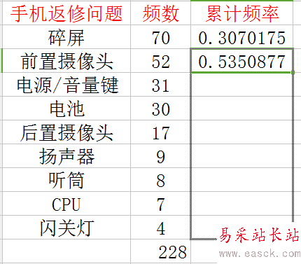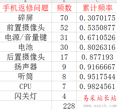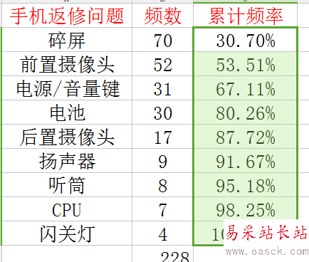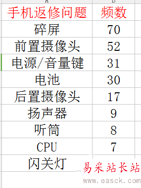 1、將所需要做帕累托圖的數據錄入wps表格或excel中,并按頻數大小進行降序排序。這里以手機返修問題數據為例。