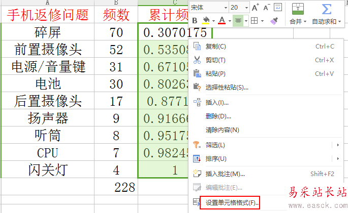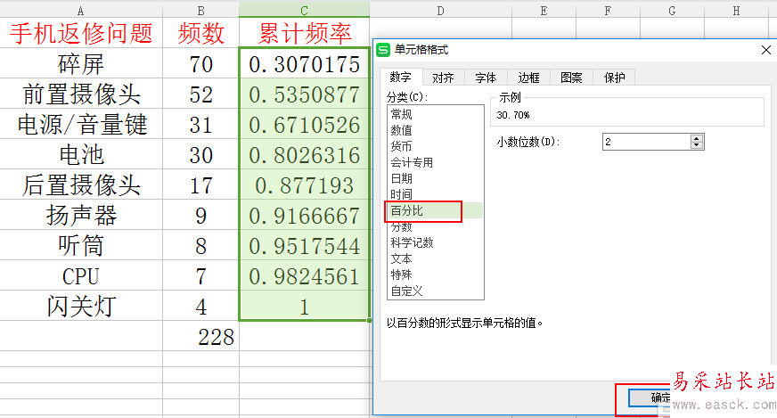 6、將累積頻率的小數轉化為百分比。選中已經計算好的累積頻率,點擊右鍵,在選擇框了,選擇單擊”設置單元格格式“,然后選擇”百分比“點擊確認。