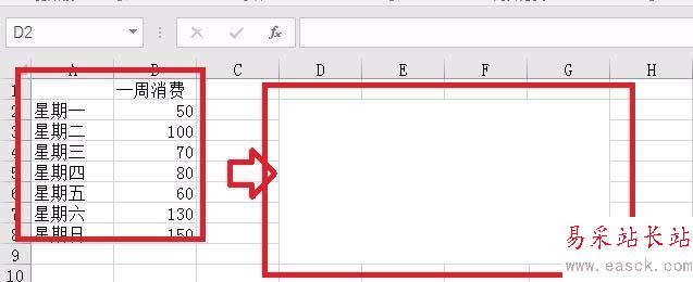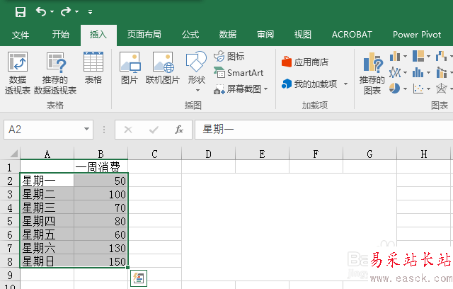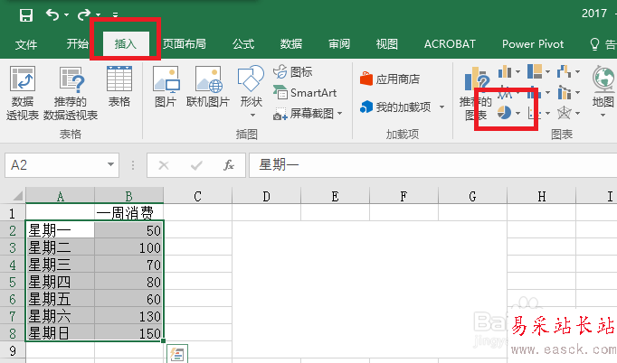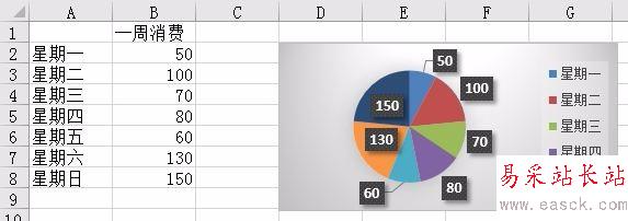 1、首先打開文檔,以一周的消費為例,在空白處插入相關的二維餅狀圖。