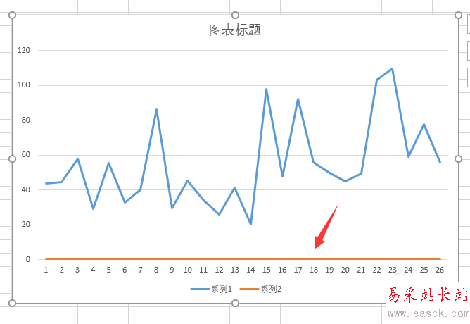 4、然后即可看到已經生成折線圖了,由于第二行數據比第一行數據小得多,因此看起來第二行數據像是直線,沒有變化