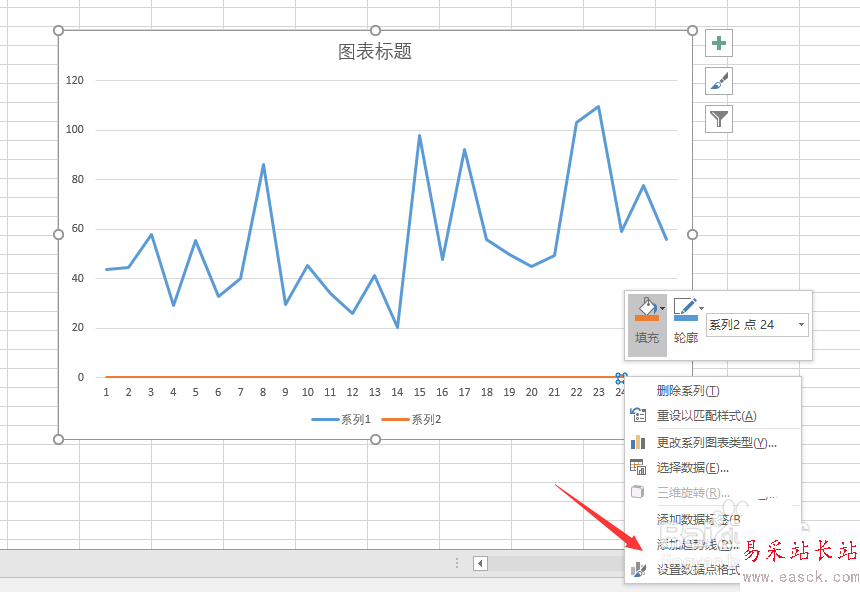 5、我們鼠標右鍵點擊第二行數據上的一個點,選擇設置數據系列格式