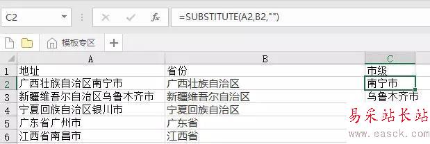 1、省份提取結(jié)束后,需要提取地市了,這個(gè)時(shí)候我們就要用到SUBSTITUTE這個(gè)文本替換函數(shù),只需要將地址表中的省份替換為空值即可。