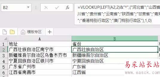 通過公式,可以快速的提取省份和城市。
